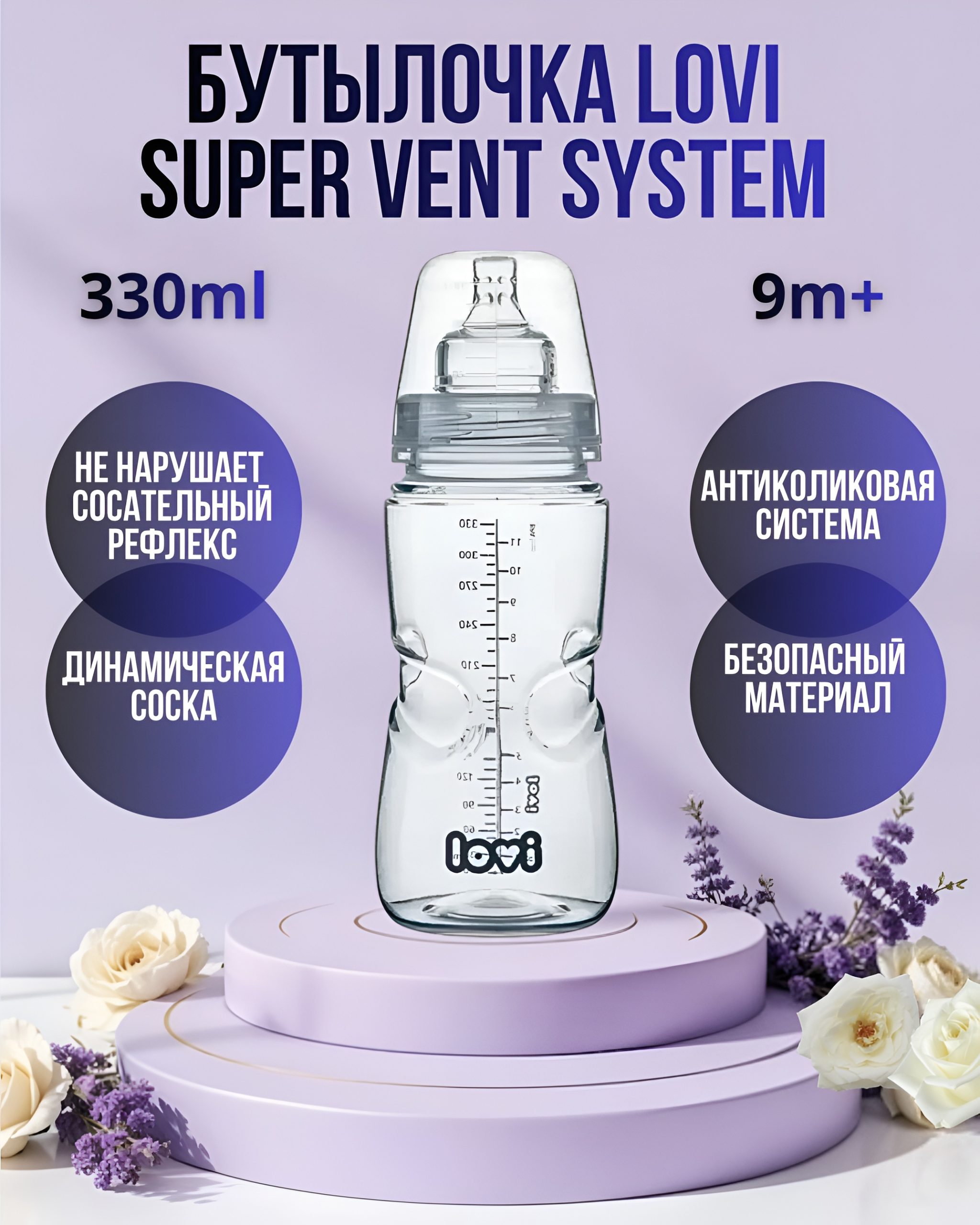 Бутылочка LOVI Medical+ объемом 330 мл с системой SUPER Vent — это самый большой объем в линейке, созданный специально для подросших детей от 9 месяцев, которым требуются увеличенные порции питания.
