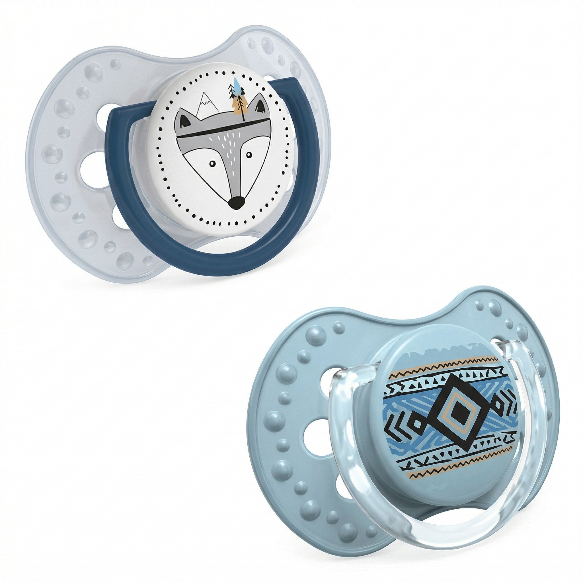 2 штуки в упаковке: В наборе представлены две пустышки с разными тематическими принтами (например, перья, этнические узоры) в единой цветовой гамме.