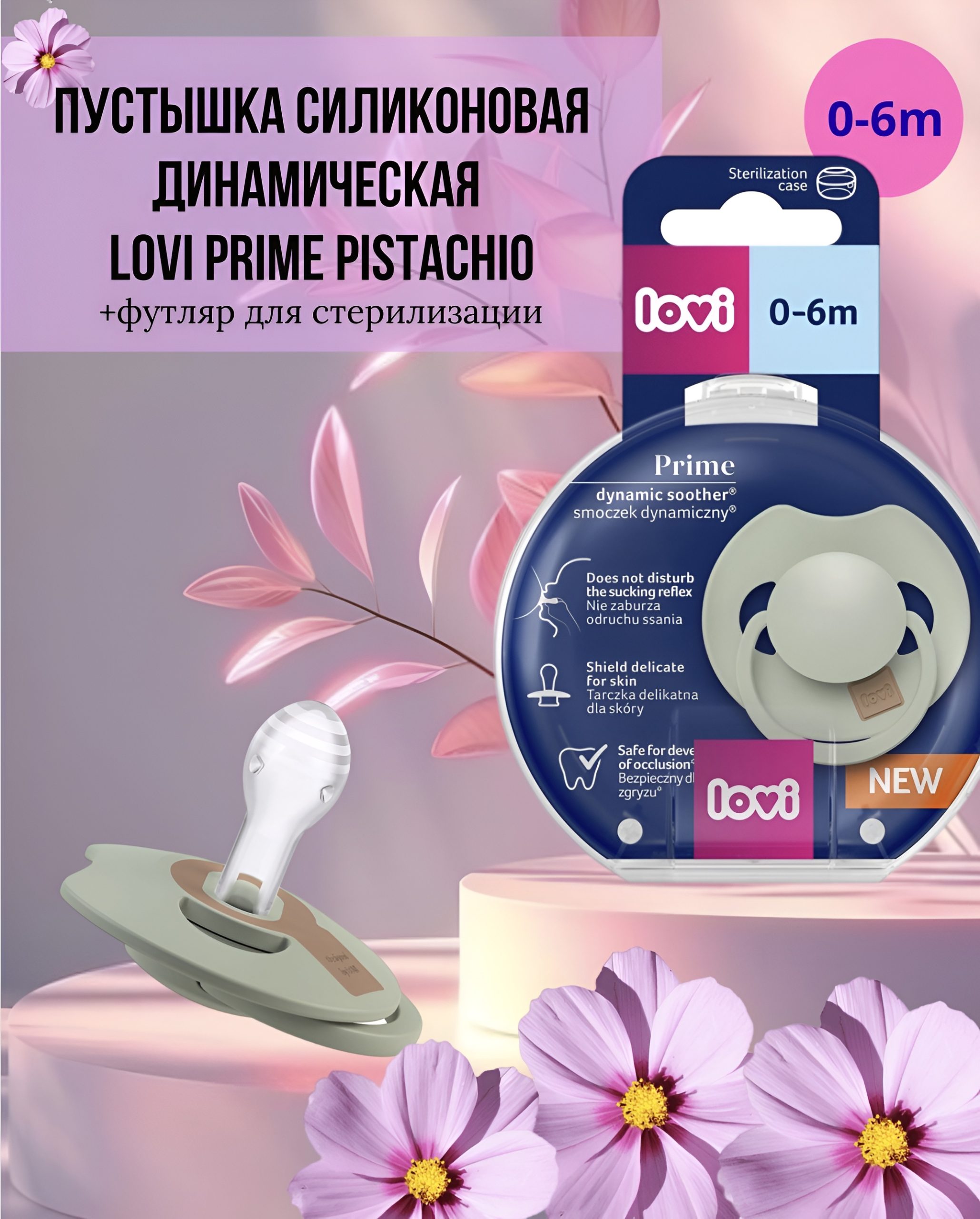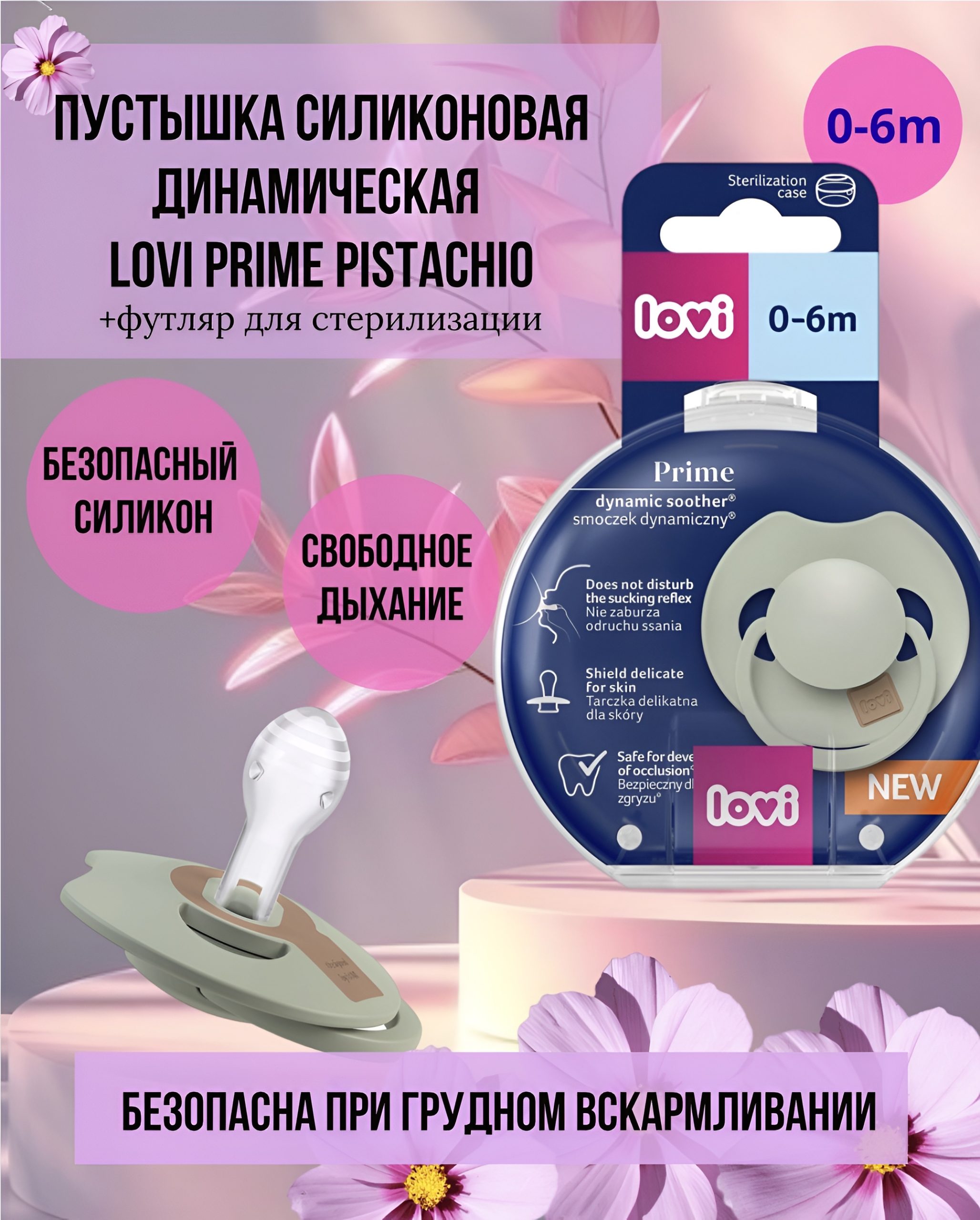 Пустышка силиконовая динамическая LOVI PRIME Pistachio, 0-6 мес., 1 шт., футляр для стерилизации